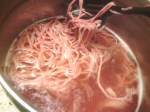 Once the strip of dough is nice and thin, pass it through the cutters to get tagliatelle or spaghetti (depending on your machine).